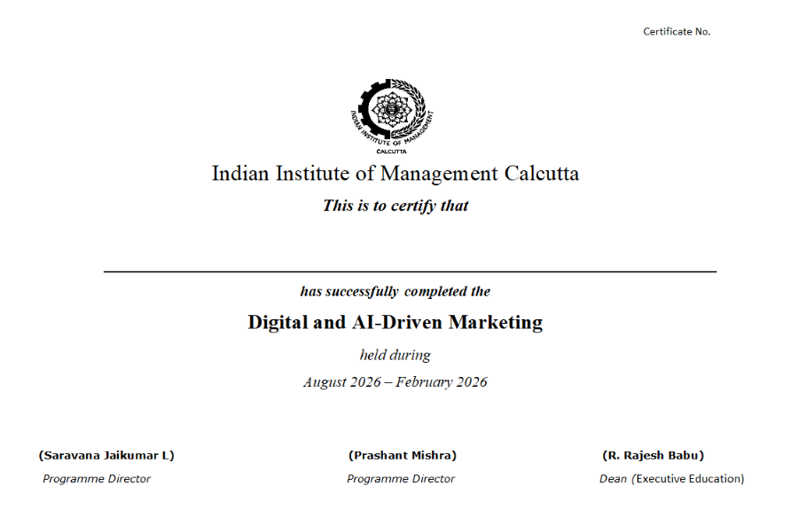 Digital & AI-Driven Marketing (DigiAIM) from IIM Calcutta, formerly EPDSMMS is a hands-on program focused on strategy and execution, equipping participants with practical insights and actionable skills for mastering today’s AI-enhanced digital landscape. Aimed to address the rapid integration of AI into marketing, this program empowers participants to leverage cutting-edge tools and practices to transform their digital marketing strategies, optimize campaigns, and deliver measurable results.The program delves into Search Engine Marketing, examining how AI is reshaping search algorithms and consumer behavior. As generative AI becomes central to how people search for information, participants will learn to adapt their strategies to this new landscape, building content that caters to both traditional search engines and AI-driven models like ChatGPT. The focus extends to creating search-friendly content that maximizes visibility and engagement in an increasingly AI-dominated ecosystem.